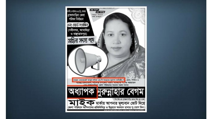 খোঁজ নিয়ে জানা যায়, নুরুন্নাহার বেগম ইতিপূর্বেও জেলা পরিষদের নির্বাচিত সদস্য ছিলেন। কিন্তু নানান অনিয়মের কারণে তিনি বরাবরের মতো বিতর্কিত ছিলেন। তার স্বামীর বাড়ি ফেনী জেলায়। তিনি উপজেলার সলিমগঞ্জ ডিগ্রি কলেজের সহকারী অধ্যাপক হয়ে নিজেকে অধ্যাপক হিসেবে পরিচয় দিয়ে বেড়াচ্ছেন। এমন কি নির্বাচনী প্রচারণার পোষ্টারে নিজের নামের আগে অধ্যাপক পদবী ব্যবহার করেছেন। তাছাড়া তিনি নির্বাচন আচরণবিধি ভঙ্গ করে পোষ্টারে প্রয়াত এক সংসদ সদস্যের নাম ব্যবহার করেছেন। যা নির্বাচনী আচরণবিধির ৮ এর ৫ উপধারার সরাসরি লঙ্ঘন করছেন।