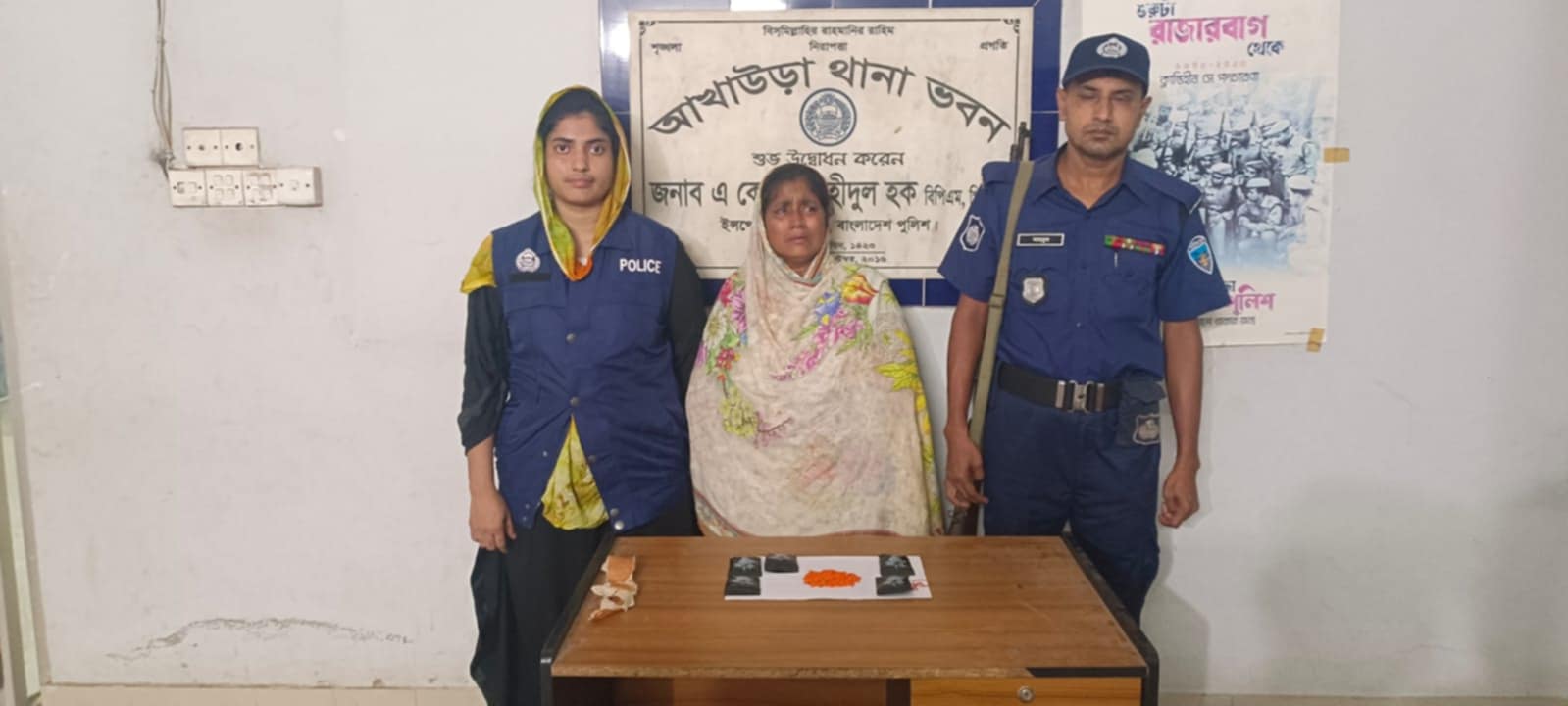 শাহাদাত হোসেন সোহেল,ব্রাহ্মণবাড়িয়া : ব্রাহ্মণবাড়িয়ায় আখাউড়ায় গোপন সংবাদের ভিত্তিতে থানা পুলিশের মাদকবিরোধী বিশেষ অভিযানে আজ (১৩ অক্টোবর ) রবিবার রাত ০৪:১০ মিনিটের দিকে নাসিমা বেগম (৪৮)স্বামী মোঃ আনিস খা,গ্রাম-মিনারকোট,ইউনিয়ন-মনিয়ন্দ থানা-আখাউড়া,জেলা- ব্রাহ্মণবাড়িয়া নামের এক মাদক কারবারীকে ১০০০ পিস ইয়াবাসহ গ্রেফতার করা হয়েছে। জেলা পুলিশের মিডিয়া উইংসের এক উদ্ধৃতি থেকে জানা যায়,আখাউড়া থানায়
