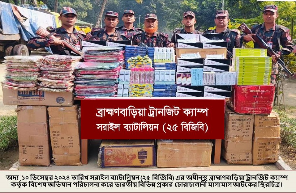 মঙ্গলবার (১০ ডিসেম্বর) আনুমানিক ৪.৩০ ঘটিকায় সরাইল ব্যাটালিয়ন (২৫ বিজিবি) এর ব্রাহ্মণবাড়িয়া ট্রানজিট ক্যাম্পের বিশেষ টহলদল গোপন সংবাদের ভিত্তিতে সীমান্ত পিলার ২০০১/এমপি হতে আনুমানিক ৫ কিঃ মিঃ বাংলাদেশের অভ্যন্তরে ব্রাহ্মণবাড়িয়ার বিজয়নগর উপজেলার চান্দুরা বাইপাস নামক এলাকায় বিশেষ অভিযান পরিচালনা করা হয়। উক্ত অভিযানে ভারতীয় উন্নতমানের বিভিন্ন প্রকার চশমা ৬,৮৮০ পিছ, ভারতীয় উন্নতমানের বিভিন্ন প্রকার শাড়ী ১৩৭ পিছ, ভারতীয় বিভিন্ন প্রকার প্রসাধনী সামগ্রী ৯৩৬ পিছ, ভারতীয় Kaveri মেহেদী ৪,৩২০ পিছ, ভারতীয় Mond সিগারেট ৯,৬০০ পিছ এবং American Cau Chocolate ১,৪৮০ পিস আটক করতে সক্ষম হয়।