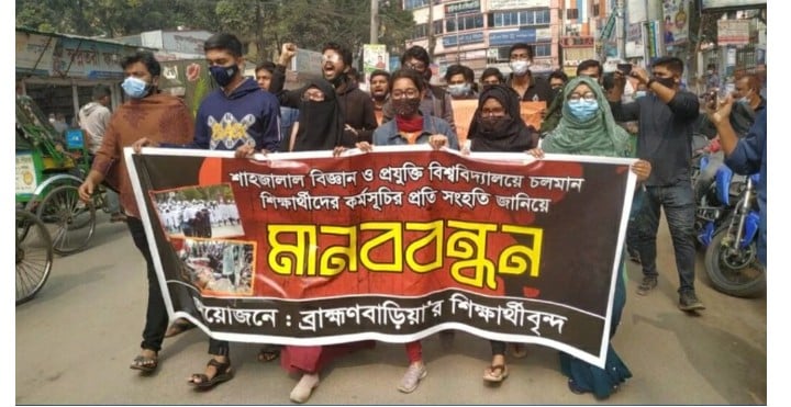 শাহজালাল বিজ্ঞান ও প্রযুক্তি বিশ্ববিদ্যালয়ে শিক্ষার্থী জাকিয়া জান্নাতের সভাপতিত্বে মানববন্ধনে বক্তব্য রাখেন রাজশাহী বিশ্ববিদ্যালয়ের শিক্ষার্থী মাহইয়ী সারদ, শাহজালাল বিজ্ঞান ও প্রযুক্তি বিশ্ববিদ্যালয়ে শিক্ষার্থী রাফিদি ইসলাম, তামান্না ইসলাম তিথি, ঢাকা মেডিকেল কলেজের মো. রাফি, জেলা ছাত্র মৈত্রীর সভাপতি ফাহিম মুনতাসীর, চট্রগ্রাম বিশ্ববিদ্যালয়ের মো. আশিক, হোমায়রা হিমু প্রমুখ।