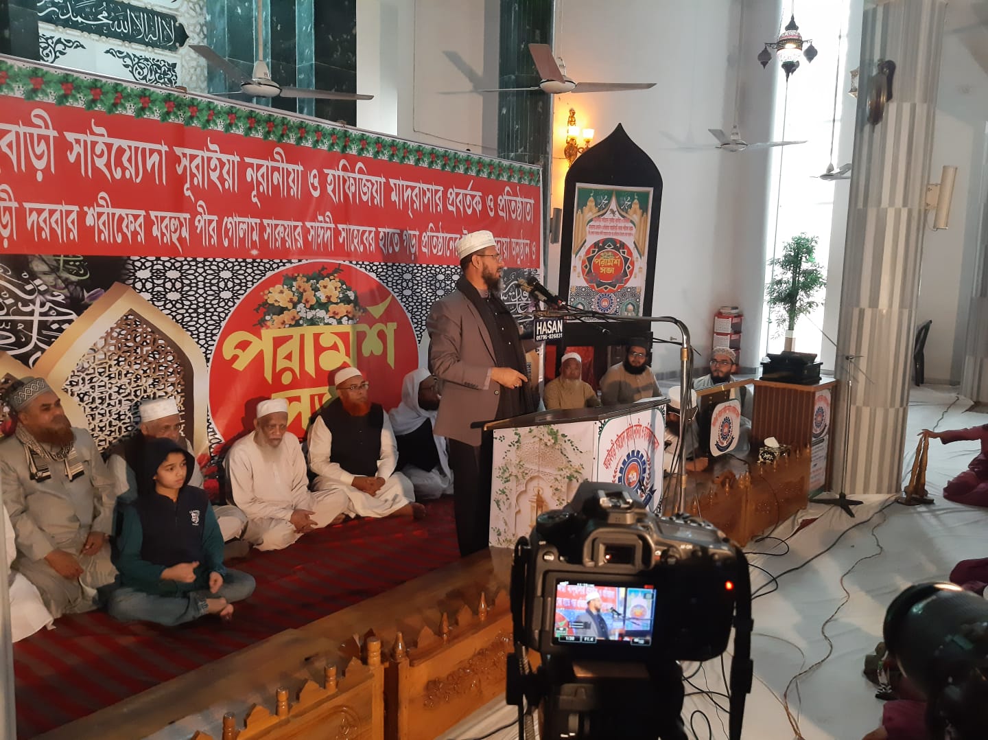 বিশ্ববরেণ্য ইসলামী চিন্তাবিদ, আড়াইবাড়ী ইসলামিয়া সাঈদীয়া কামিল মাদ্রাসার সাবেক অধ্যক্ষ, আড়াইবাড়ী দরবার শরীফের মরহুম পীরে কামেল আল্লামা হযরত মাওলানা মোহাম্মদ গোলাম সারোয়ার সাঈদী (র) এর জন্য শুক্রবার বাদ জুমআ আয়োজিত দোআ মাহফিলে প্রধান অতিথি হিসেবে উপস্থিত ছিলেন বাংলাদেশের আলোড়ন সৃষ্টিকারী বক্তা, আগাইস দরবার শরীফের আল্লামা হযরত মাওলানা মোস্তাক ফয়েজী পীর সাহেব। প্রধান অতিথির বক্তব্যে তিনি বলেন, আড়াইবাড়ী দরবার শরীফের মরহুম পীরে কামেল আল্লামা গোলাম সারোয়ার সাঈদী (র) দ্বীন প্রতিষ্ঠায় নিরলসভাবে কুরআন সুন্নাহ মোতাবেক নিজের জীবনকে উৎসর্গ করে গিয়েছেন। মাদরাসা প্রতিষ্ঠা করে বিশুদ্ধভাবে কুরআন শিক্ষার আয়োজন করে গেছেন। জীবদ্দশায় তাঁর সাথে সাক্ষাৎকালে দরদমাখা, মায়াভরা কথাগুলো শুনে পারস্পরিক সম্প্রীতি আরো বেড়ে যেতো। তাঁর এ শূন্যতা কখনো পূরণ হবার নয়। আজ তাঁর সন্তানের হাফেজে কুরআন হওয়ার গৌরবগাঁথা পাগরীখানা পড়াতে এসে আমি গর্বিত।