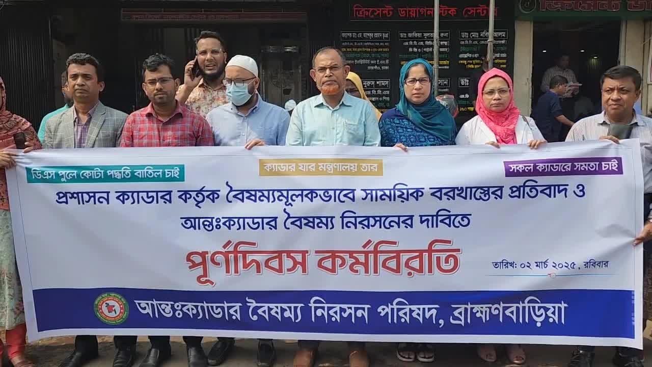 মো. আজহার উদ্দিন,ব্রাহ্মণবাড়িয়া : প্রশাসন ক্যাডার কর্তৃক বৈষম্যমূলকভাবে সাময়িক বরখাস্তের প্রতিবাদে ও আন্তঃক্যাডার বৈষম্য নিরসনের দাবীতে ব্রাহ্মণবাড়িয়ায় পূর্ণ দিবস কর্মবিরতী পালন করেছে প্রশাসন ব্যতীত ২৫ ক্যাডারের কর্মকর্তারা।