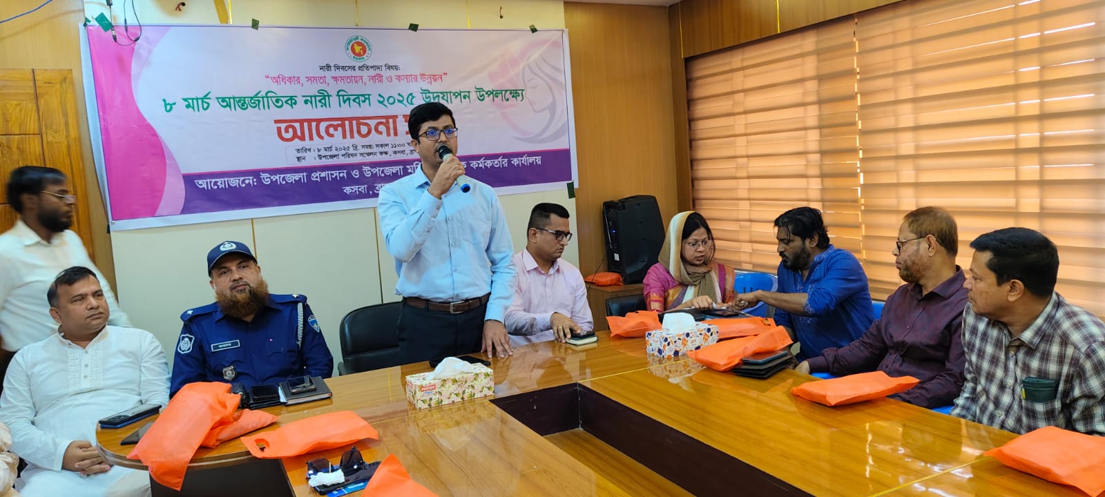 শনিবার (০৮ মার্চ) দুপুরে উপজেলা প্রশাসন ও উপজেলা মহিলা বিষয়ক কর্মকর্তার কার্যালয়ের আয়োজনে উপজেলা নির্বাহী অফিসারের সম্মেলন কক্ষে উপজেলা নির্বাহী অফিসার মো. ছামিউল ইসলামের সভাপতিত্বে সভায় বক্তব্য রাখেন; সহকারী কমিশনার (ভূমি) মো. গোলাম সারোয়ার, কসবা থানা অফিসার ইনচার্জ মোহাম্মদ আবদুল কাদের,  উপজেলা জামায়াতের আমির অধ্যক্ষ ফরিদ উদ্দিন আহম্মদ, উপজেলা বিএনপির সাধারণ সম্পাদক মো. শরিফুল হক স্বপন, উপজেলা জামায়াতের সেক্রেটারি মাওলানা শিবলী নোমানী, তফাজ্জল আলী ডিগ্রি কলেজের অধ্যক্ষ আবুল কালাম আজাদ, কসবা প্রেসক্লাবের সভাপতি মো. আবুল খায়ের স্বপন। উপজেলা মহিলা বিষয়ক কর্মকর্তা রওনক ফারজানা রুবার সঞ্চালনায় আরও বক্তব্য রাখেন, কসবা সরকারি উচ্চ বিদ্যালয়ের সিনিয়র শিক্ষক মো. শফিকুর রহমান, ছাত্র প্রতিনিধি মো. আমিনুল ইসলাম। এসময় বিভিন্ন শিক্ষা প্রতিষ্ঠানের প্রধান, বিভিন্ন নারী সংগঠনের প্রধান, বিভিন্ন পেশার নারী, প্রিন্ট ও ইলেকট্রনিক মিডিয়ার সাংবাদিক ও গণ্যমান্য ব্যক্তিবর্গ উপস্থিত ছিলেন।