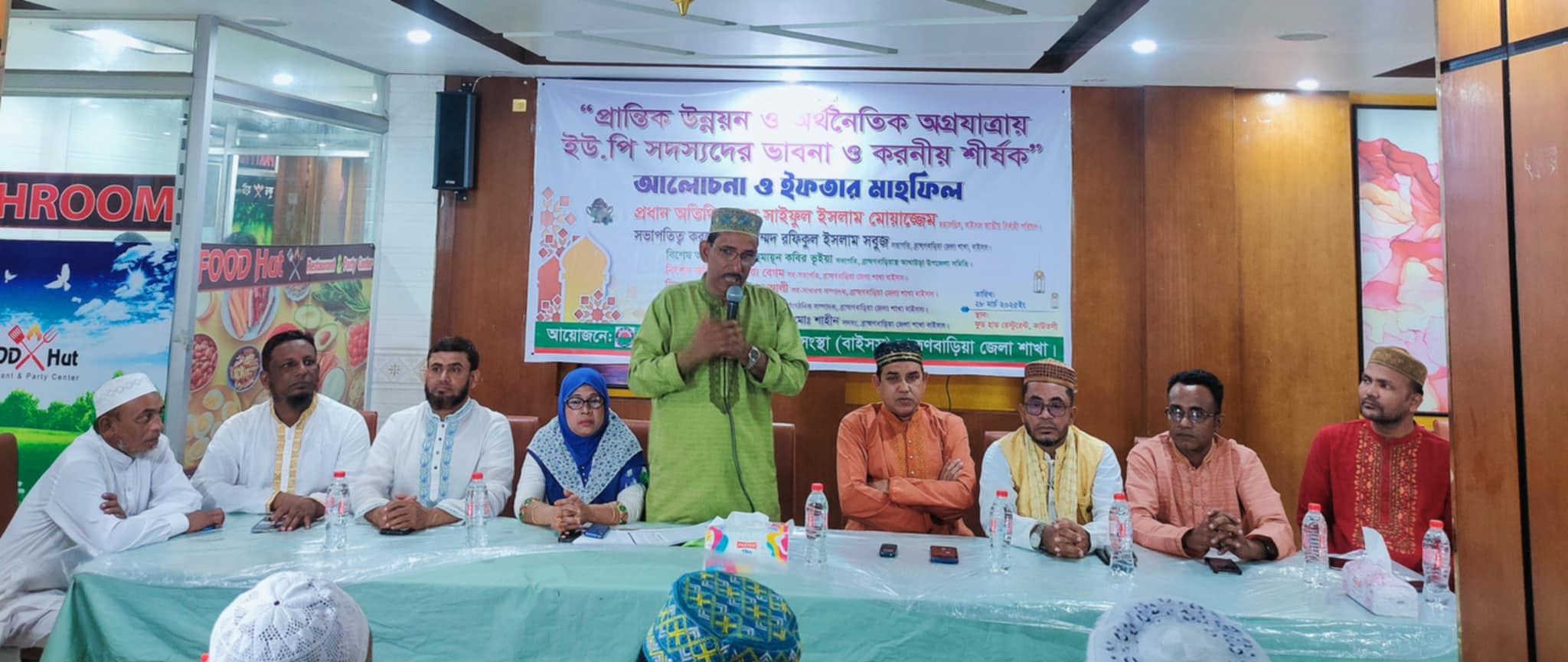 শাহাদাত হোসেন সোহেল,ব্রাহ্মণবাড়িয়া : বাংলাদেশ ইউনিয়ন সদস্য সংস্থা ( বাইসস ) ব্রাহ্মণবাড়িয়া জেলা শাখার আয়োজনে “প্রান্তিক উন্নয়ন ও অর্থনৈতিক অগ্রযাত্রায় ইউ.পি সদস্যদের ভাবনা ও করনীয় শীর্ষক” এক আলোচনা সভা ইফতার ও দোয়া মাহফিল অনুষ্ঠিত হয়েছে। (২৮ মার্চ) ২০২৫ শুক্রবার শহরের কাউতলীতে অবস্হিত ফুট হাট রেস্টুরেন্ট এন্ড পার্টি সেন্টারে এই আলোচনা সভা দোয়া ও ইফতার মাহফিল অনুষ্ঠিত হয়।