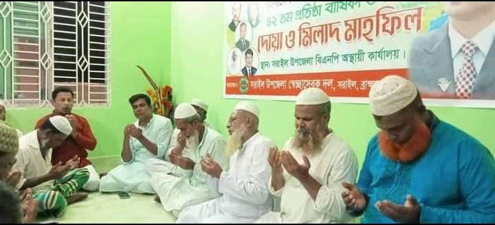 মো.রুবেল মিয়া: ব্রাহ্মণবাড়িয়ার সরাইলে বাংলাদেশ স্বেচ্ছাসেবক দলের ৪২তম প্রতিষ্ঠা বার্ষিকী উপলক্ষ্যে আজ ১৯ আগস্ট, শুক্রবার বিকালে উপজেলা বিএনপির অস্থায়ী কার্যালয়ে আলোচনা সভা ও দোয়া মাহফিল এর আয়োজন করেন উপজেলা স্বেচ্ছাসেবক দল।