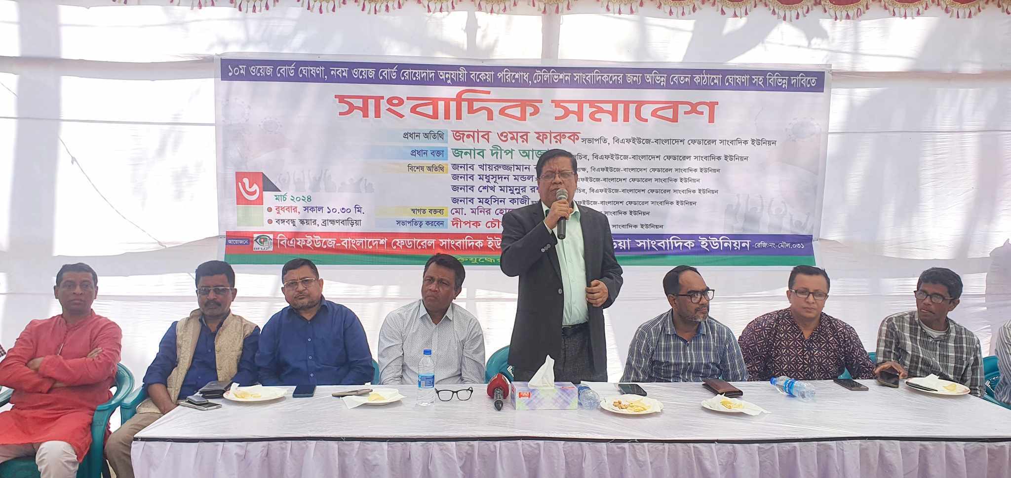 বুধবার সকালে ব্রাহ্মণবাড়িয়া সাংবাদিক ইউনিয়ন আয়োজিত সাংবাদিক সমাবেশে বক্তারা এ কথা বলেন। ১০ ওয়েজ বোর্ড ঘোষণা, নবম ওয়েজ বোর্ড রোয়েদাদ অনুযায়ি বকেয়া পরিশোধ, টেলিভিশন সাংবাদিকদের জন্য অভিন্ন বেতন কাঠামো ঘোষণাসহ বিভিন্ন দাবিতে এ সমাবেশ অনুষ্ঠিত হয়।