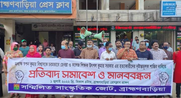 অধ্যক্ষ স্বপন কুমার বিশ্বাসকে চরমভাবে হেনস্তা ও কলেজ শিক্ষক উৎপল কুমার সরকারকে হত্যাকারীদের দৃষ্টান্তমূলক শাস্তির দাবিতে প্রতিবাদ সমাবেশ ও মানববন্ধন করেছে সম্মিলিত সাংস্কৃতিক জোট, ব্রাহ্মণবাড়িয়া।