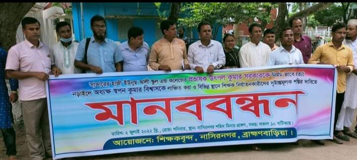 নাসিরনগর প্রতিনিধি : সাভারে শিক্ষক হত্যা, নড়াইলে শিক্ষক নির্যাতন ও নিপীড়নের প্রতিবাদে মানববন্ধন ও প্রতিবাদ সমাবেশ করেছে ব্রাহ্মণবাড়িয়ার নাসিরনগরের বিভিন্ন শিক্ষাপ্রতিষ্ঠানের শিক্ষকবৃন্দ।