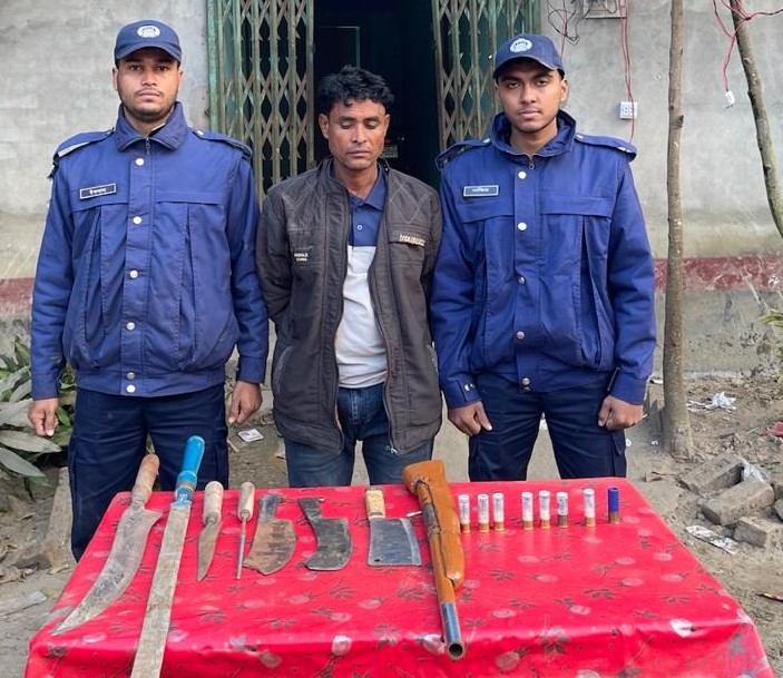 মো. আবদুল মতিন নবীনগর,ব্রাহ্মণবাড়িয়া: ব্রাহ্মণবাড়িয়ার নবীনগরে থানা পুলিশ বিশেষ অভিযান চালিয়ে একটি দেশীয় তৈরী এল জি,৮টি কার্তুজ,১ টি রামদা,৩ টি চাপাতি,২ টি ছুরি ও একটি গ্রীল বা তালা কাটার রেতসহ মকবুল হোসেন (৪৫) নামের ১ জন আসামিকে গ্রেফতার করেছে। (২৯ডিসেম্বর) রবিবার ০৭:০৫ মিনিটে গোপন সংবাদের ভিত্তিতে অভিযান চালিয়ে তাকে গ্রেফতার করা হয়। গ্রেফতারকৃত মকবুল হোসেন জেলার নবীনগর থানার ছলিমগঞ্জ ইউনিয়নের পশ্চিম ধরাভাঙ্গার মৃত ফজলু মিয়ার ছেলে।পুলিশ মিডিয়া উইংসের তথ্য মতে,নবীনগর থানায় কর্মরত এস আই (নিঃ) মোঃ আব্দুল মোনাফ তার সঙ্গীয় ফোর্স সহ অভিযান চালিয়ে আসামীর বসত ঘর থেকে উল্লেখিত অস্ত্রসহ তাকে গ্রেফতার করে।এ ব্যপারে নবীনগর থানার অফিসার ইনচার্জ (ওসি) আব্দুর রাজ্জাক বলেন, আসামীর বিরুদ্ধে গৃহীত ব্যবস্থা  (মামলা/জিডি): নবীনগর থানায় মামলা নং-২৭, তারিখ- ২৯/১২/২০২৪ ধারা- Arms act 1878 এর 19A/19(f) অনুযায়ী বিচারিক কার্যক্রমের জন্য আদালতে প্রেরণ করা হয়েছে।