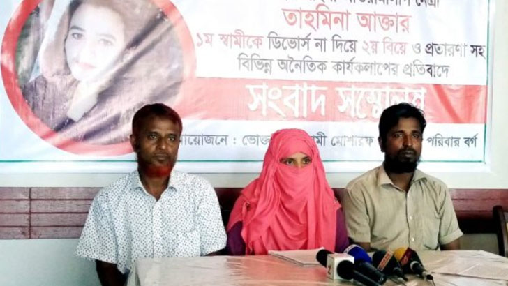 সংবাদ সম্মেলনে স্বামী মোশারফ হোসেনের বোন ফারজানা আক্তার জানান, ২০০৬ সালে রায়পুরা উপজেলার আদিয়াবাদ শিকদারপাড়া এলাকার মৃত আব্দুল মন্নাফ মুন্সির মেয়ে তাহমিনা বেগমকে বিয়ে করেন সৌদি প্রবাসী মোশারফ হোসেন। বিয়ের পর থেকেই নানাভাবে সুকৌশলে নগদ অর্থ হাতিয়ে নেয়াসহ অনৈতিক সম্পর্কে জড়িয়ে পড়ে নেত্রী তাহমিনা। পরে প্রথম স্বামীকে তালাক না দিয়েই ফ্রান্স প্রবাসী রায়হান মিয়াকে বিয়ে করার অভিযোগ উঠেছে। এ বিষয়ে নরসিংদী সদর মডেল থানায় একটি অভিযোগ দায়ের করেছেন ভুক্তভোগী প্রবাসীর পরিবার।