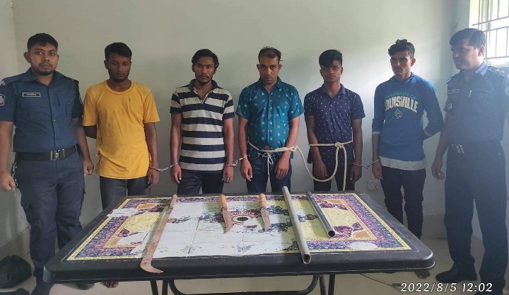 গ্রেফতারকৃতরা হলেন- উপজেলার জাঙ্গাল গ্রামের হারিজ মিয়ার ছেলে উবায়দুল হক প্রকাশ ভুট্টু মিয়া(৩৮), টানোয়াপাড়ার জমশেদ মিয়ার ছেলে আমিনুল ইসলাম প্রকাশ তুফান(২৫), গাংভাঙ্গা গ্রামের শানু মিয়ার ছেলে আল আমিন মিয়া(২৩), দরুইন গ্রামের রেনু মিয়ার ছেলে রায়হান মিয়া(২০) এবং বড় গাঙ্গাইল গ্রামের (বর্তমানে দরুইন পশ্চিমপাড়ার বাসিন্দা) রহিম চৌধুরীর ছেলে ইকরাম চৌধুরী(২০)। অপর আসামীরা দৌড়াইয়া পালায়ন করে। তাদের নিকট থেকে ০১ টি ধারালো রামদা, ০২ টি ছুরি, ০২ টি ষ্টিলের পাইপ উদ্ধার করা হয়।