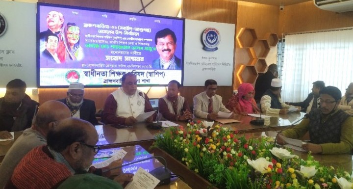 সংবাদ সম্মেলনে লিখিত বক্তব্য পাঠ করেন স্বাধীনতা শিক্ষক পরিষদ (স্বাশিপ) ব্রাহ্মণবাড়িয়া জেলা শাখার সভাপতি আকরাম খান।