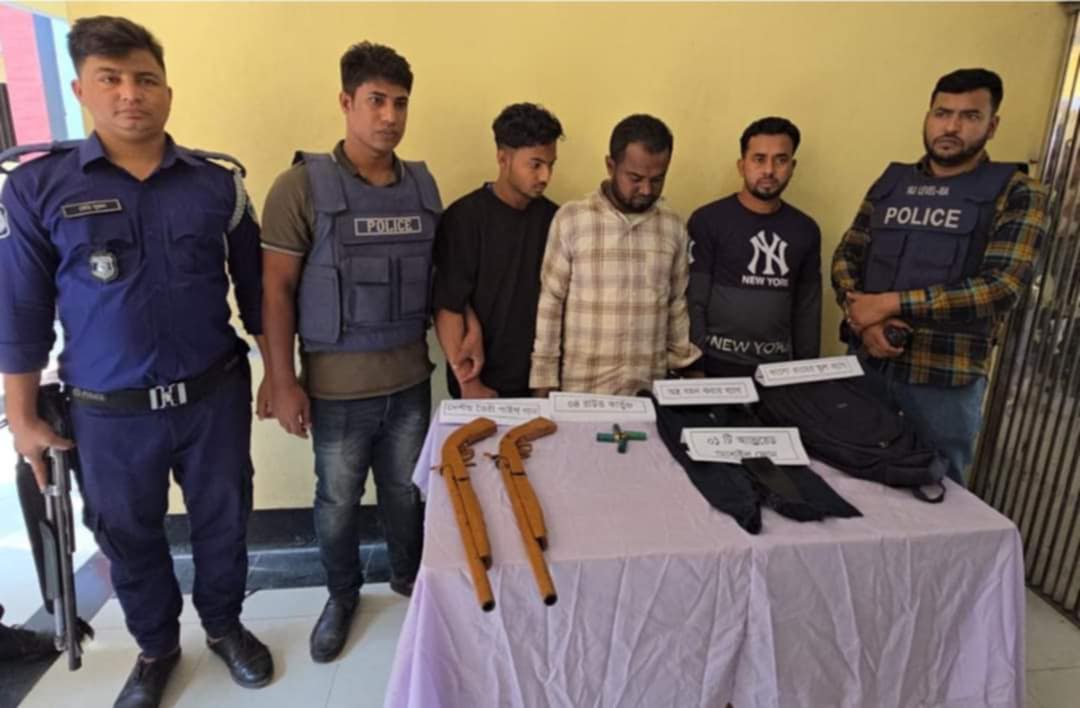 শাহাদাত হোসেন সোহেল,ব্রাহ্মণবাড়িয়া : ব্রাহ্মণবাড়িয়ার নবীনগর থানার কৃষ্ণনগর ইউনিয়নের সীতারামপুর ব্রীজের উপর ডাকাতির প্রস্তুতিকালে ২ টি দেশীয় তৈরি পাইপ গান (বন্দুক) ও ৪ রাউন্ড কার্তুজসহ চার ডাকাতকে গ্রেফতার করেছে পুলিশ। ২৪ নভেম্বর ২০২৪ ইং তারিখ রাত আনুমানিক ০২:৩০ মিনিটের দিকে তাদেরকে গ্রেফতার করা হয়। তারা হলেন, আলী প্র: জাহঙ্গীর(২৮) পিতা- মৃত সুদন মিয়া,আব্দুল হাদী (৩৫)পিতা-মোঃ হারুন অর রশিদ,মেরাজুল ইসলাম (২৫)পিতা-মোঃ রফিকুল ইসলাম ও মোঃ আবুল কালাম (৩০)পিতা- হাজী আব্দুল বারী উভয় গ্রাম – মহিনিপুর,ইউনিয়ন-চাঁনপুর,থানা- রায়পুরা,জেলা- নরসিংদী। পুলিশ ও মিডিয়া উইংসের তথ্যমতে, রাত ০১:৩৫ মিনিটের সময় এসআই আক্কাস আলী, এসআই মোঃ মাহমুদ হাসান তার সঙ্গীয় অফিসার ও ফোর্সসহ অভিযানিক ডিউটি করা কালে কৃষ্ণনগর ইউনিয়নের সীতারামপুর ব্রীজের উপর থেকে ডাকাতির প্রস্তুতিকালে উপরে উল্লেখিত এই চার ডাকাতকে হাতে নাতে গ্রেফতার করে ও তাদের হেফাজত থেকে ২ টি দেশীয় তৈরি পাইপ গান (বন্দুক)ও ৪ রাউন্ড কার্তুজ উদ্ধার করে। এ ব্যপারে নবীনগর থানার অফিসার ইনচার্জ (ওসি) আব্দুর রাজ্জাক জানান,আটকৃত আসামিদের বিরুদ্ধে নবীনগর থানায় গৃহীত ব্যবস্থা অনুযায়ী মামলা রুজু করে বিচারিক কার্যক্রমের অংশ হিসেবে আদালতে প্রেরণ করা হয়েছে।