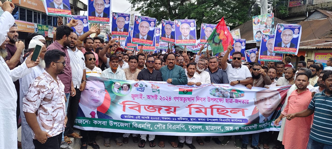 অধ্যাপক শেখ কামাল উদ্দিন,বিশেষ প্রতিনিধি : ব্রাহ্মণবাড়িয়ার কসবায় জুলাই গণঅভ্যুত্থান দিবস উপলক্ষে ছাত্র-জনতার বিজয় মিছিল অনুষ্ঠিত হয়েছে। মঙ্গলবার ০৫ আগস্ট বেলা ১১টার দিকে কসবা উপজেলা বিএনপি, পৌর বিএনপি, যুবদল, ছাত্রদল, অঙ্গ ও সহযোগী সংগঠনের উদ্যোগে এ বিজয় মিছিল অনুষ্ঠিত হয়। এ সময় কসবা উপজেলা বিএনপি’র স্থানীয় কার্যালয়ের সামনে থেকে একটি বিজয় মিছিল বের হয়। মিছিলটি পৌর শহরের প্রধান প্রধান সড়ক প্রদক্ষিণ শেষে সুপার মার্কেট চত্বরে সভা অনুষ্ঠিত হয়।
