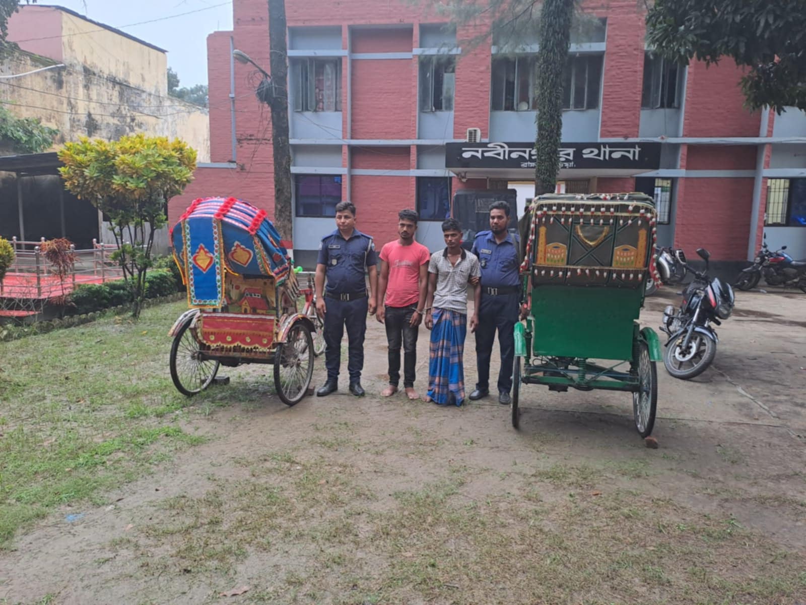 শাহাদাত হোসেন সোহেল,ব্রাহ্মণবাড়িয়া : ব্রাহ্মণবাড়িয়ার নবীনগরে চুরি হওয়া ব্যাটারি চালিত ২ টি অটোরিক্সাসহ অলিউল্লাহ (৩০) পিতা- মৃত: জামাল মিয়া গ্রাম- ইব্রাহিমপুর,থানা- নবীনগর-জেলা- ব্রাহ্মণবাড়িয়া ও মোঃ মিজান (২৬)পিতা-মৃত: রাকিবুল ইসলাম,গ্রাম-জিটকা (চৌকিদার বাড়ি),থানা- বোরহানউদ্দিন,জেলা-ভোলা নামের দুই চোরকে গ্রেফতার করেছে নবীনগর থানা পুলিশ। পুলিশের এক প্রেস ব্রিফিং থেকে জানা যায়, গত ৩ সেপ্টেম্বর ২৪ ইং তারিখে নবীনগর থানার ইব্রাহিমপুর ইউনিয়নের ইব্রাহিমপুর গ্রামের আবুল হোসেনের গ্যারেজ থেকে ০২ টি ব্যাটারি চালিত অটো রিক্সা চুরি হয়ে যায়। পরবর্তীতে বাদীর অভিযোগের প্রেক্ষিতে নবীনগর থানা পুলিশ আজ ২৯ সেপ্টেম্বর ২৪ ইং দুপুর ২ টার দিকে অভিযান চালিয়ে চুরির ঘটনায় জড়িত ০২ জন চোরকে গ্রেফতারসহ চুরি হওয়া ০২ টি ব্যাটারি চালিত অটো রিক্সা কুমিল্লা জেলার কোতয়ালী থানা এলাকা থেকে উদ্ধার করে। এ ব্যাপারে নবীনগর থানার অফিসার ইনচার্জ (ওসি) মোঃ হুমায়ুন কবীর বলেন, আমরা অভিযান চালিয়ে চুরি হওয়া ব্যাটারিচালিত ২ টি অটোরিক্সা উদ্ধার ও চুরির ঘটনায় যুক্ত দুই চোরকে গ্রেফতার করতে সক্ষম হয়েছি। থানায় গ্রেফতারকৃত আসামীদের বিরুদ্ধে আইনগতভাবে মামলা পূর্বক ব্যাবস্থা নেওয়া হয়েছে। তিনি আরও বলেন,যে কোন অপরাধীর বিরুদ্ধে আমাদের অবস্হান জিরো টলারেন্স। নবীনগর থানা এলাকার শান্তি ও শৃঙ্খলা সমুন্নত রাখতে আমরা বদ্ধপরিকর।