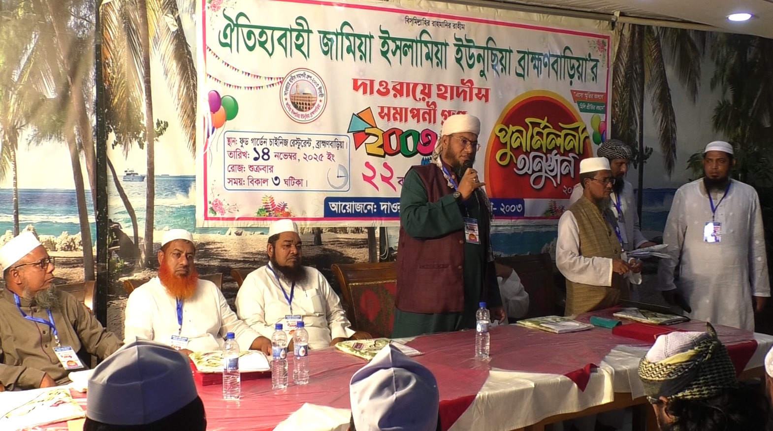 অনুষ্ঠানে একে অপরের সঙ্গে কুশল বিনিময়, পুরোনো দিনের স্মৃতিচারণ আর আড্ডায় মেতে ওঠেন সবাই। তাদের প্রাণবন্ত আড্ডা আর উচ্ছ্বাসে রেস্টুরেন্টের পরিবেশ উৎসবমুখর হয়ে ওঠে। এই পুনর্মিলনী অনুষ্ঠানে উপস্থিত ছিলেন আব্দুল্লাহ, আতাউল, আঃ হক, অলিউল্লাহ, মোঃ মোখলিছুর রহমান, ছিদ্দিকুর রহমান, মাওলানা খোরশেদ আলম, সাইফুল্লাহ, জয়নাল আবেদীন, মাওলানা শফিকুল ইসলাম, মাওলানা মুস্তাক আহমদ, মাওলানা জাকির হোসাইন, মাওলানা জিয়াউর রহমান, মাওলানা ইউসুফ বিন ইয়াকুব, মাওলানা জালাল উদ্দিন, মাওলানা আব্দুল বাসির, মাওলানা কামাল উদ্দিন ডাইমি, মাওলানা সাখাওয়াত হুসাইন, মাওলানা মোঃ উল্লাহ, মাওলানা সাইফুল্লাহ সাদি, মাওলানা মিজানুর রহমান, মাওলানা ওমর ফারুক সিদ্দিক মোঃ কামাল উদ্দিনসহ আরও অনেকে। আয়োজকরা জানান, কর্মব্যস্ত জীবনের মাঝে ভ্রাতৃত্বের বন্ধনকে আরও সুদৃঢ় করতে এই আয়োজন। ভবিষ্যতেও এ ধরনের উদ্যোগ অব্যাহত রাখার আশাবাদ ব্যক্ত করেন তারা।দীর্ঘ ২২ বছর পর আবারও একত্রিত হলেন ব্রাহ্মণবাড়িয়ার ঐতিহ্যবাহী জামিয়া ইসলামিয়া ইউনুছিয়া মাদ্রাসার দাওরায়ে হাদীস সমাপনী গ্রুপ ২০০৩-এর প্রাক্তন শিক্ষার্থীরা। পুরোনো দিনের স্মৃতিচারণা, আড্ডা আর অনাবিল আনন্দে এক আবেগঘন মুহূর্তের সৃষ্টি হয় তাদের এই পুনর্মিলনী অনুষ্ঠানে। শুক্রবার (১৪ নভেম্বর, ২০২৫) বিকেলে ব্রাহ্মণবাড়িয়া শহরের ফুড গার্ডেন চাইনিজ রেস্টুরেন্টে এই মিলনমেলার আয়োজন করা হয়। দাওরায়ে হাদীস সমাপনী গ্রুপ ২০০৩-এর প্রাক্তন শিক্ষার্থীদের উদ্যোগে আয়োজিত এই অনুষ্ঠানে দেশের বিভিন্ন প্রান্তে কর্মরত আলেমরা অংশ নেন। অনেকদিন পর প্রিয় সহপাঠীদের কাছে পেয়ে অনেকেই আবেগাপ্লুত হয়ে পড়েন।