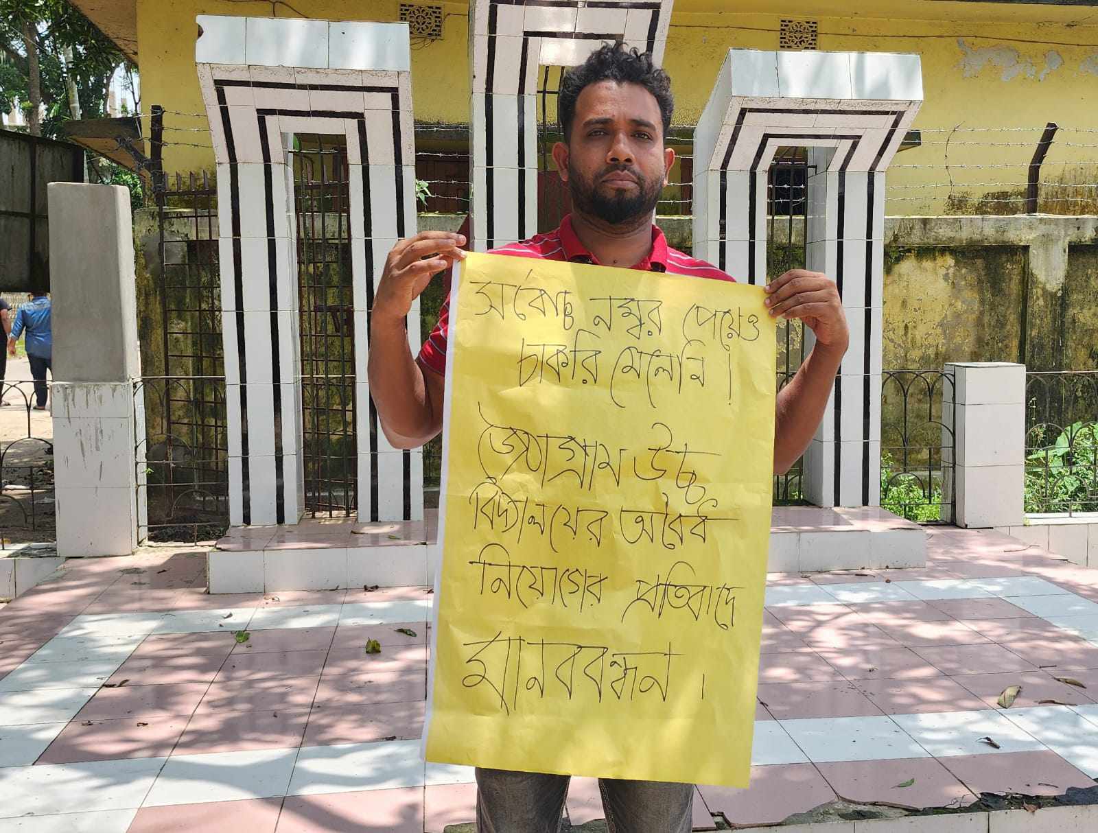 মোঃ নিয়ামুল ইসলাম আকঞ্জি,ব্রাহ্মণবাড়িয়া : ব্রাহ্মণবাড়িযার নাসিরনগরে একটি মাধ্যমিক বিদ্যালয়ের অফিস সহায়ক পদে লিখিত-মৌখিক পরীক্ষায় প্রথম হয়েও নিয়োগ পায়নি মো. মঈন উদ্দিন নামে এক যুবক। বিদ্যালয় কর্তৃপক্ষ অনৈতিক সুবিধা নিয়ে দ্বিতীয় হওয়া ব্যক্তিকে নিয়োগ দিয়েছেন। তাই চাকুরি পেতে একাই প্লেকার্ড হাতে নিয়ে মানববন্ধন করেছেন প্রথম হওয়া এই যুবক।