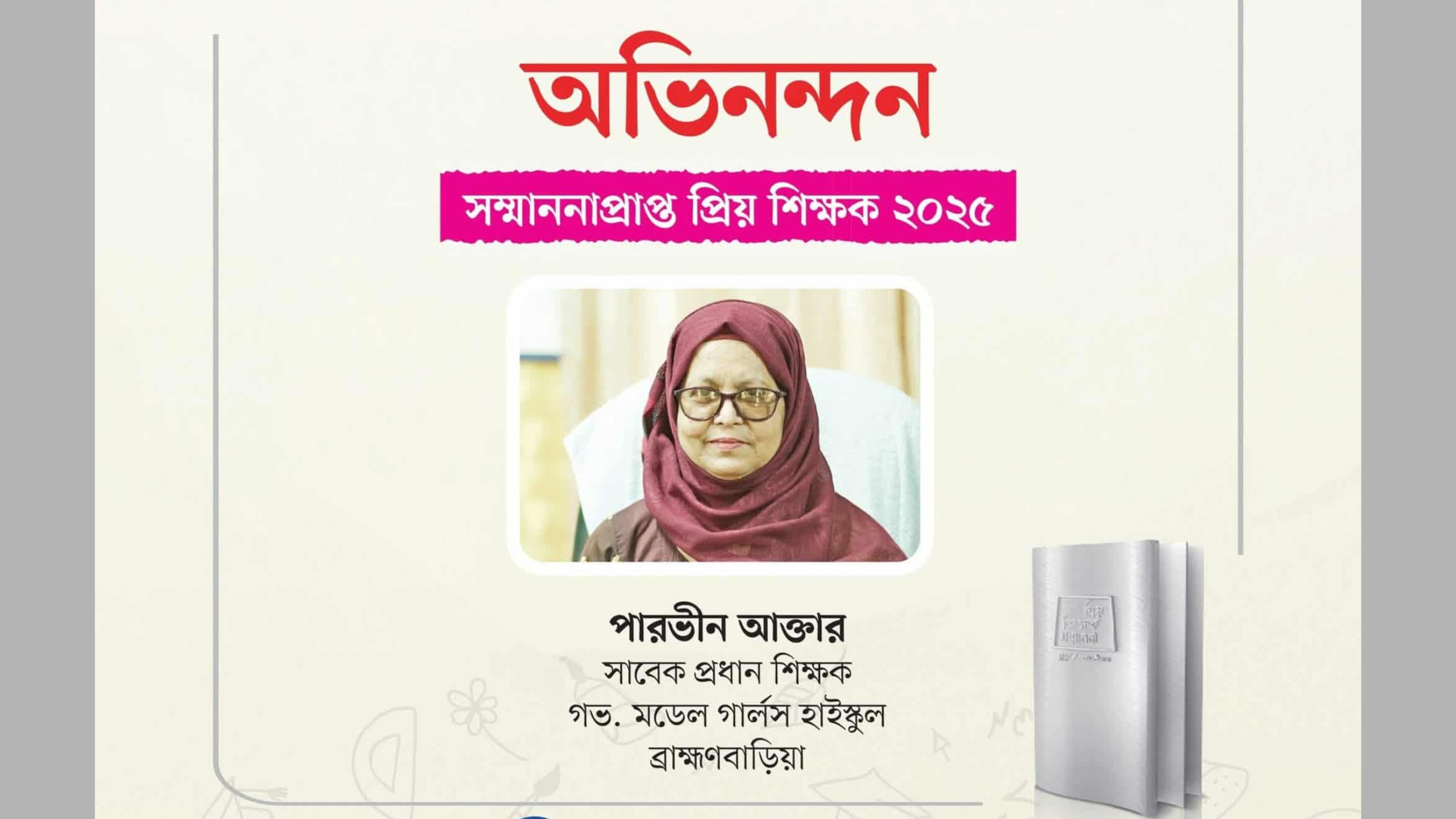 নিজস্ব প্রতিবেদক : চার দশকের বেশি সময় ধরে শিক্ষাক্ষেত্রে অসামান্য অবদানের স্বীকৃতিস্বরূপ ‘আইপিডিসি-প্রথম আলো প্রিয় শিক্ষক সম্মাননা ২০২৫’-এ ভূষিত হয়েছেন ব্রাহ্মণবাড়িয়া গভ. মডেল গার্লস হাই স্কুলের সাবেক প্রধান শিক্ষক জনাব পারভীন আক্তার।
