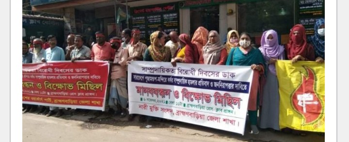 সাম্রদায়িকতা বিরোধী দিবসের ডাকে সারাদেশে পূজামন্ডপ, মন্দিরে বর্বর হামলার প্রতিবাদে ও জননিরাপত্তার দাবীতে বাংলাদেশের ওয়ার্কার্স পার্টির কেন্দ্রীয় কর্মসূচীর অংশ হিসেবে ৬ নভেম্বর শনিবার বেলা ১১ টায় প্রেস ক্লাব চত্বরে মানববন্ধন ও বিক্ষোভ কর্মসূচী পালন করেছে ব্রাহ্মণবাড়িয়া জেলা ওয়ার্কার্স পার্টি। জেলা ওয়ার্কার্স পার্টির সভাপতি কমরেড অ্যাড.কাজী মাসুদ আহমেদ এর সভাপতিত্বে এবং জেলা ওয়ার্কার্স পার্টির সদস্য কমরেড নজরুল ইসলামের পরিচালনায় মানববন্ধনে বক্তব্য রাখেন জেলা ওয়ার্কার্স পার্টির সাধারণ সম্পাদক কমরেড আবু সাঈদ খান, জেলা ওয়ার্কার্স পার্টির সদস্য কমরেড মো.নাসির মিয়া, জেলা জাতীয় শ্রমিক ফেডারেশনের সহ-সভাপতি সামসুল আলম, জেলা নারী মুক্তি সংসদের সভাপতি কমরেড ফজিলাতুন্নাহার, সাধারণ সম্পাদক খালেদা মুন্নী, সাংগঠনিক সম্পাদক কোহিনূর আক্তার প্রিয়া। জেলা যুব মৈত্রীর আহ্বায়ক কমরেড অ্যাড.মো.নাসির, সদস্য সচিব কমরেড ফরহাদুল ইসলাম পারভেজ, জেলা ছাত্র মৈত্রীর সভাপতি ফাহিম মুনতাসির ও জেলা ছাত্র মৈত্রী নেতা মুহয়ী শারদ প্রমুখ।