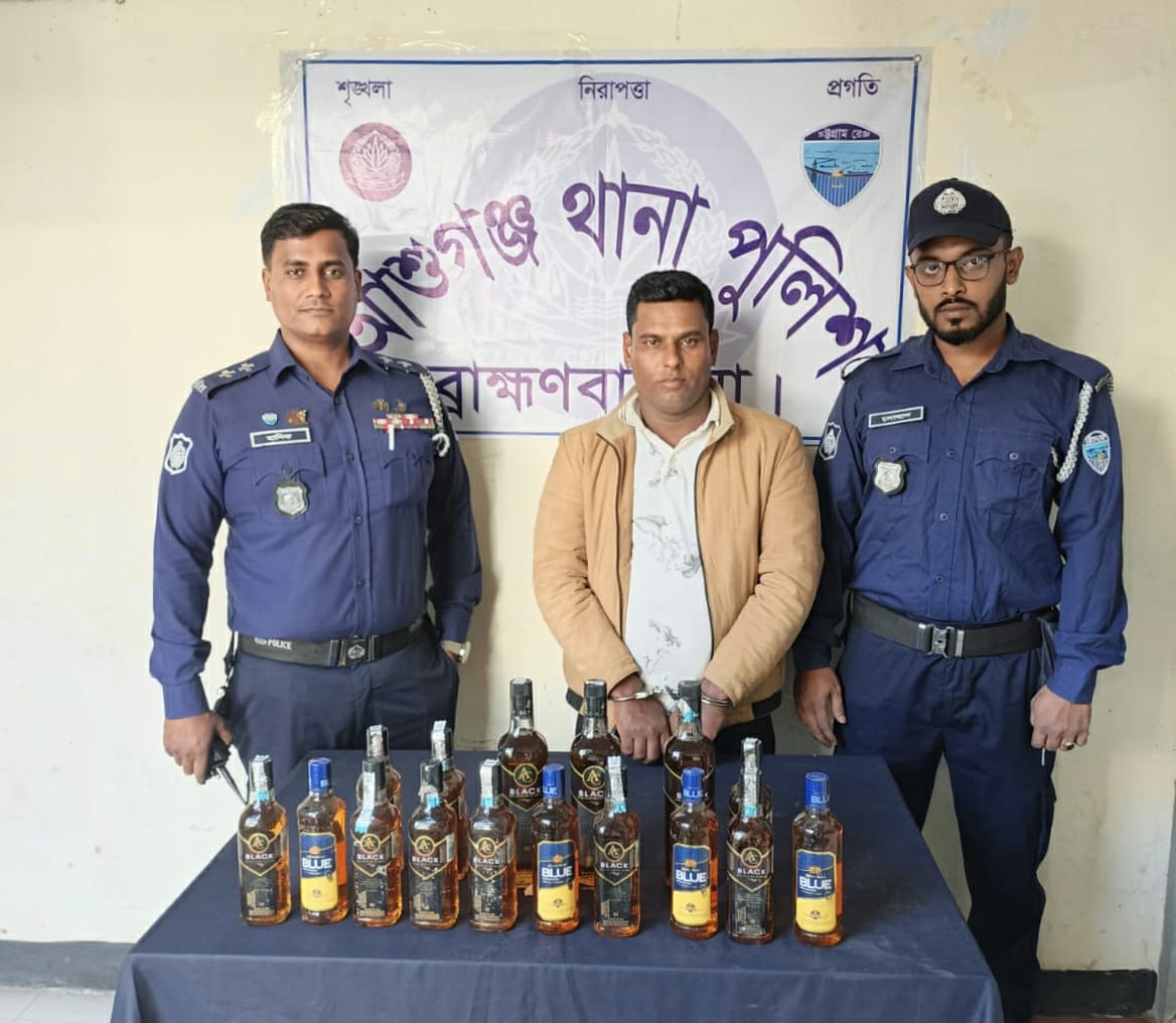 শাহাদাত হোসেন সোহেল,ব্রাহ্মণবাড়িয়া : ব্রাহ্মণবাড়িয়ার আশুগঞ্জে গোপন সংবাদের ভিত্তিতে থানা পুলিশের একটি চৌকস টিম মাদক বিরোধী এক বিশেষ অভিযান পরিচালনা করে ১৬ (ষোল) বোতল বিদেশী মদ সহ নিরেন্দ্র পাল (৩৪) নামের এক মাদক কারবারীকে গ্রেপ্তার করেছে। মাদক কারবারী নিরেন্দ্র পাল সুনামগঞ্জ জেলার জামালগঞ্জ থানার বদরপুর গ্রামের হিরেন্দ্র পালের ছেলে।