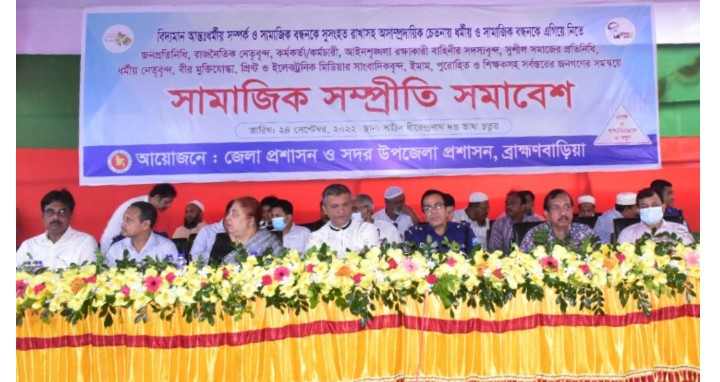 ধর্মীয় সামাজিক সম্প্রীতি সুসংহত করতে ব্রাহ্মণবাড়িয়ায় জেলা ও উপজেলা প্রশাসনের উদ্যোগে সামাজিক সম্প্রীতি সমাবেশ অনুষ্ঠিত হয়েছে। শনিবার (২৪ সেপ্টেম্বর) বিকেলে স্থানীয় ধীরেন্দ্র নাধ দত্ত ভাষা চত্তরে আয়োজিত সামাজিক সম্প্রীতি সমাবেশ প্রধান অতিথি হিসেবে বক্তব্য রাখেন জেলা প্রশাসক মো. শাহগীর আলম।