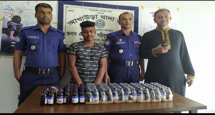 পুলিশ জানায়, জেলা পুলিশের মাদক বিরোধী অভিযানের অংশ হিসাবে আখাউড়া থানার উপ পরিদর্শন (এসআই) আবু ছালেক সঙ্গীয় ফোর্স নিয়ে গোপন সংবাদ মাধ্যমে খবর পেয়ে অভিযান চালিয়ে পৌর এলাকার বাইপাস রেল গেইট সংলগ্ন থেকে তাকে আটক করে। এসময় আটকৃতের কাছ থেকে বিক্রির উদ্দেশ্যে আনা ১০০ বোতল স্কফ সিরাপ উদ্ধার করে থানায় নিয়ে আসে। উক্ত মাদক উদ্ধারের ঘটনায় তার বিরুদ্ধে মাদকদ্রব্য নিয়ন্ত্রণ আইনে মামলা দিয়ে শুক্রবার (২১ অক্টোবর) দুপুরে আদালতের মাধ্যমে জেল হাজতে পাঠিয়েছে পুলিশ।