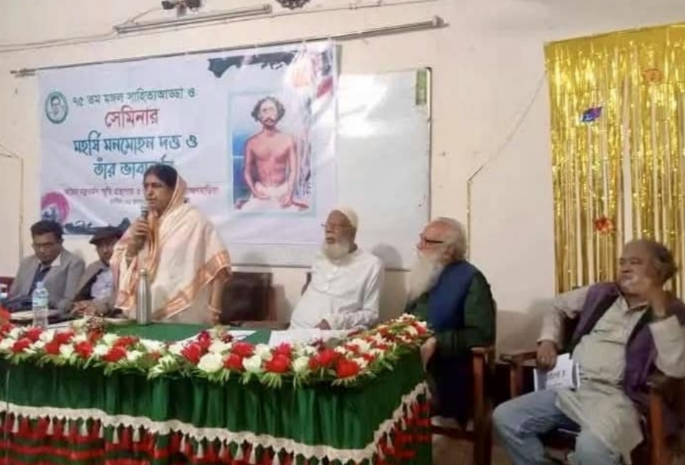 বিশেষ প্রতিনিধি : গত ৩১ জানুয়ারি শুক্রবার বিকাল ৪টায় অদ্বৈত মল্লবর্মণ স্মৃতি গ্রন্থাগার ও গবেষণা কেন্দ্রের আয়োজনে মহর্ষি মনোমোহন দত্ত ও তাঁর ভাবদর্শন শীর্ষক এক সেমিনার আয়োজন করা হয়। ব্রাহ্মণবাড়িয়া সরকারি মহিলা কলেজ অডিটরিয়ামে অনুষ্ঠিত সেমিনারে মূল প্রবন্ধ উপস্থাপন করেন শিল্প সমালোচক রফিক সুলায়মান। প্রধান অতিথি ছিলেন ‘মহর্ষি মনোমোহন দত্ত আশ্রেমর অধ্যক্ষ সাধ্বী শংকরী দত্ত। বাংলাদেশ রাইটার্স ক্লাবের সাধারণ সম্পাদক ড. শাহ মোহাম্মদ সানাউল হকের সঞ্চালনায় আলোচনায় অংশ নেন কবি ও কথাশিল্পী এডভোকেট মানিক রতন শর্মা, কবি আমির হোসেন, কবি ও সাংবাদিক রুদ্র মোহাম্মদ ইদ্রিস। এসময় বক্তব্য রাখেন, কবি আব্দুল মান্নান সরকার, কবি জয়দুল হোসেন, অধ্যাপক মানবর্দ্ধন পাল,অধ্যাপক মুসলেম উদ্দিন সাগর, অধ্যাপক এম এ হানিফ, কবি ও অধ্যাপক মহিবুর রহিম,কবি ও গীতিকার আ. রহিম, কবি সাদমান শাহিদ, স্বরূপ রতন দত্ত, দেবাশীষ দাশ সোহেল, কসবা প্রেসক্লাব সভাপতি সোলেমান খান, কবি শারমিন সুলতানা, নির্মল বর্মণ প্রমুখ। অনুষ্ঠানে স্বাগত বক্তব্য ও ধন্যবাদ জ্ঞাপন করেন অদ্বৈত মল্লবর্মণ স্মৃতি গ্রন্থাগার ও গবেষণা কেন্দ্রের সদস্য সচিব এড. হুমায়ুন কবীর।