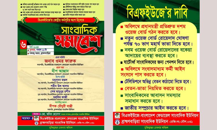জাকারিয়া জাকির : প্রধানমন্ত্রী প্রতিশ্রুত দশম ওয়েজবোর্ড গঠন, ষাটোর্ধ সাংবাদিকদের জন্য পেনশন চালু, বেতন-ভাতা নিয়মিতকরণ, আবাসন সমস্যার সমাধান, জাতীয় সম্প্রচার আইন চালুসহ বিভিন্ন দাবী বাস্তবায়নের লক্ষ্যে, আগামী ৬ মার্চ বুধবার ব্রাহ্মণবাড়িয়ায় সাংবাদিক সমাবেশ অনুষ্ঠিত হবে। দাবী বাস্তবায়নের বিএফইউজে এর কেন্দ্রীয় কর্মসূচীর অংশ হিসেবে ব্রাহ্মণবাড়িয়া শহরের বঙ্গবন্ধু স্কয়ারে ওইদিন সকাল ১১টায় অনুষ্ঠিতব্য এ সাংবাদিক সমাবেশে প্রধান অতিথি হিসেবে উপস্থিত থাকবেন, বিএফইউজে-বাংলাদেশ ফেডারেল সাংবাদিক ইউনিয়নের সভাপতি সংগ্রামী জননেতা ওমর ফারুক।