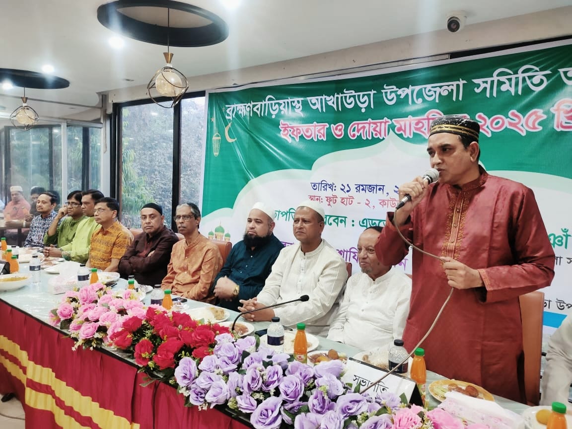 শাহাদাত হোসেন সোহেল,ব্রাহ্মণবাড়িয়া : পবিত্র মাহে রমযানকে উপলক্ষ করে ব্রাহ্মণবাড়িয়ার ঐতিহ্যবাহী সংগঠন ব্রাহ্মণবাড়িয়াস্হ আখাউড়া উপজেলা সমিতির আয়োজনে ধর্মীয় ভাব গাম্ভীর্যতার মধ্য দিয়ে এক ইফতার ও দোয়া মাহফিল অনুষ্ঠিত হয়েছে। ব্রাহ্মণবাড়িয়াস্হ আখাউড়া সমিতির সাধারন সম্পাদক মোঃ শাফির উদ্দিন চৌধুরী রনির সঞ্চালনায় ও যুগ্ন সাধারন সম্পাদক মোঃ ইকবাল হোসেন ভূইয়ার কোরআন তেলাওয়াতের মধ্য দিয়ে ব্রাহ্মণবাড়িয়াস্হ আখাউড়া সমিতির সভাপতি কবি এডঃ হুমায়ুন কবীর ভূইয়ার সভাপতিত্বে গত শনিবার ( ২২ মার্চ) ২০২৫ ইং ব্রাহ্মণবাড়িয়ার শহরের কাউতলীতে অবস্হিত ফুট হার্ট রেষ্টুরেন্টে সমিতির সকল সদস্যবৃন্দ ও সমাজের গন্যমান্য ব্যাক্তিবর্গের অংশগ্রহণের মধ্য দিয়ে এই ইফতার ও দোয়ার মাহফিল অনুষ্ঠিত হয়। অনুষ্ঠিত হওয়া এই ইফতার ও দোয়ার মাহফিলে বিশেষ মেহমান হিসেবে উপস্হিত ছিলেন,